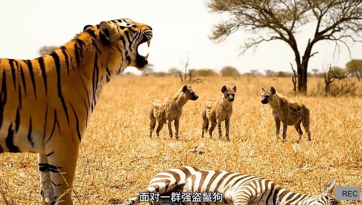 不过高调的虎哥很快就引来了强盗,一群流着哈喇的鬣狗在不远处盯着。虽说没文化的鬣狗已经知道草原上来了新物种,也深知对方的战斗力,但面对爽口的斑马大餐,鬣狗们还是没有控制住欲望朝着老虎靠近。